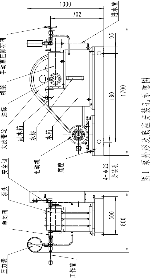 本泵為臥式三柱塞泵,由電動機、皮帶輪、動力端、泵頭和底座等組成。(圖1)
